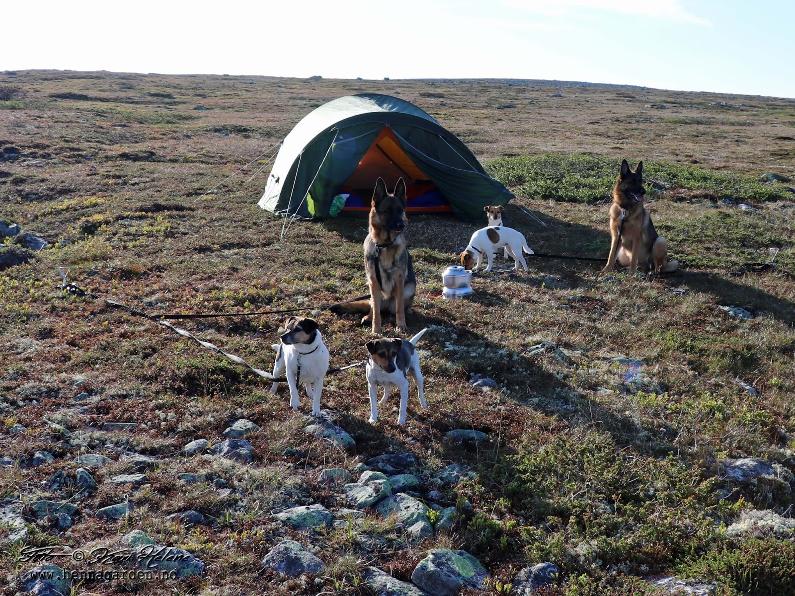 Bikkjene går opp på steiner, som de er vant til fra turer hjemme.